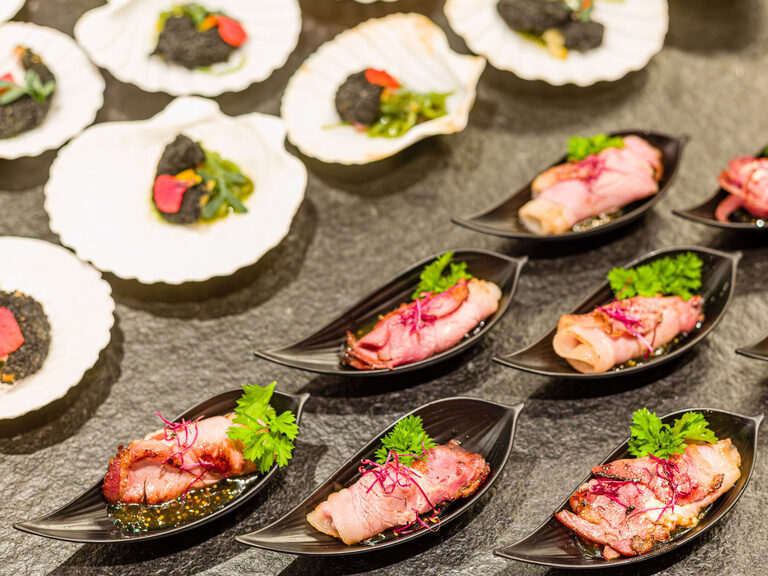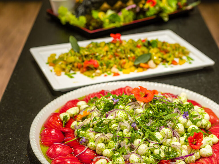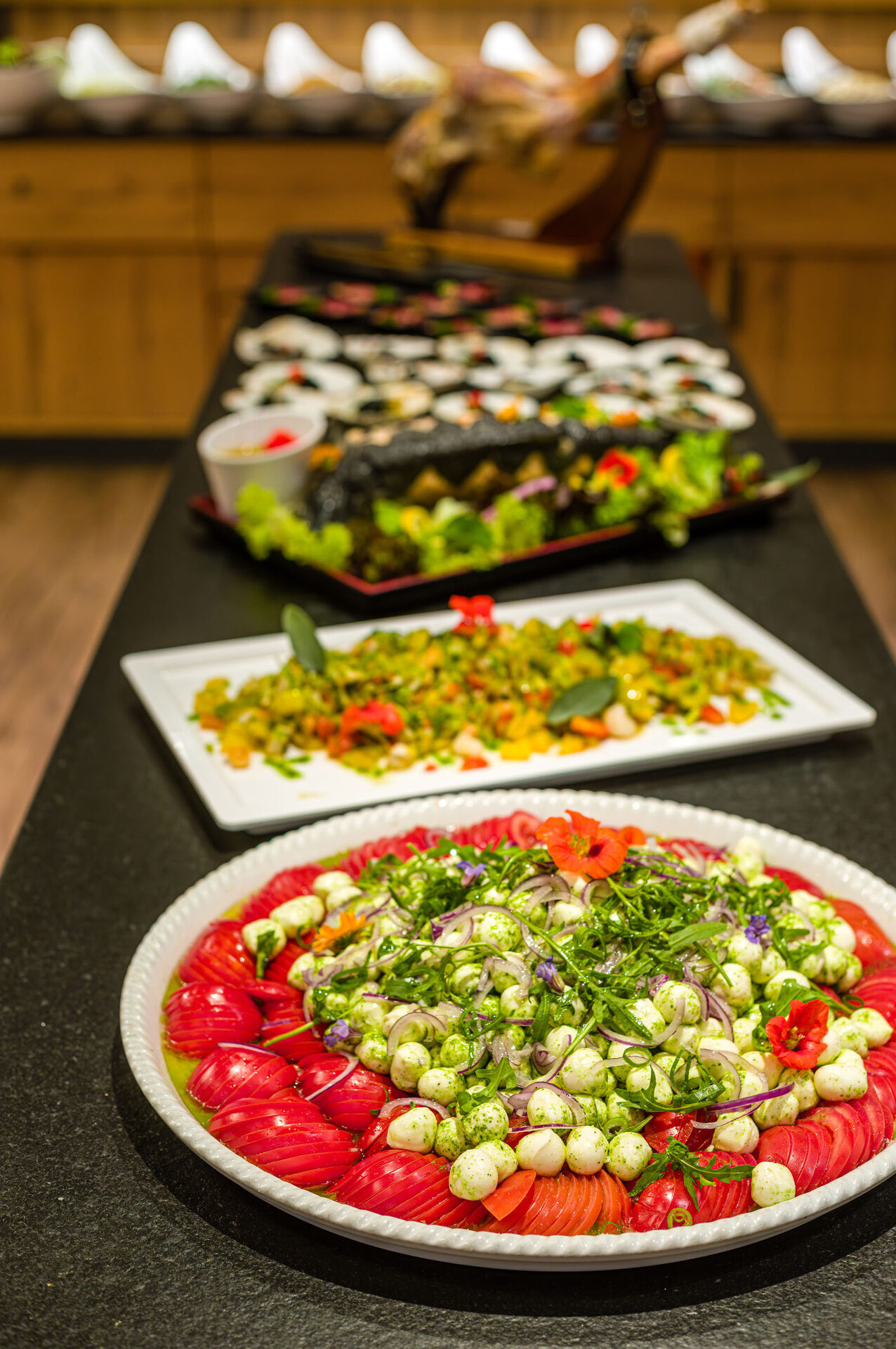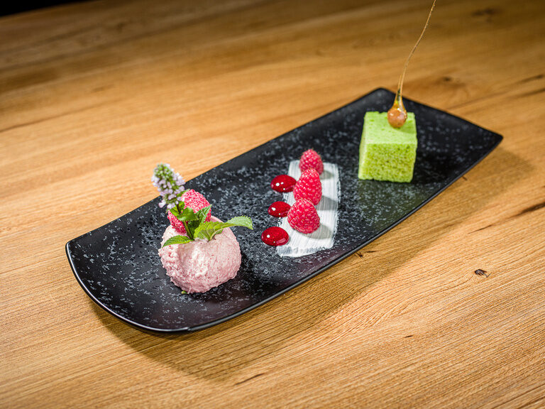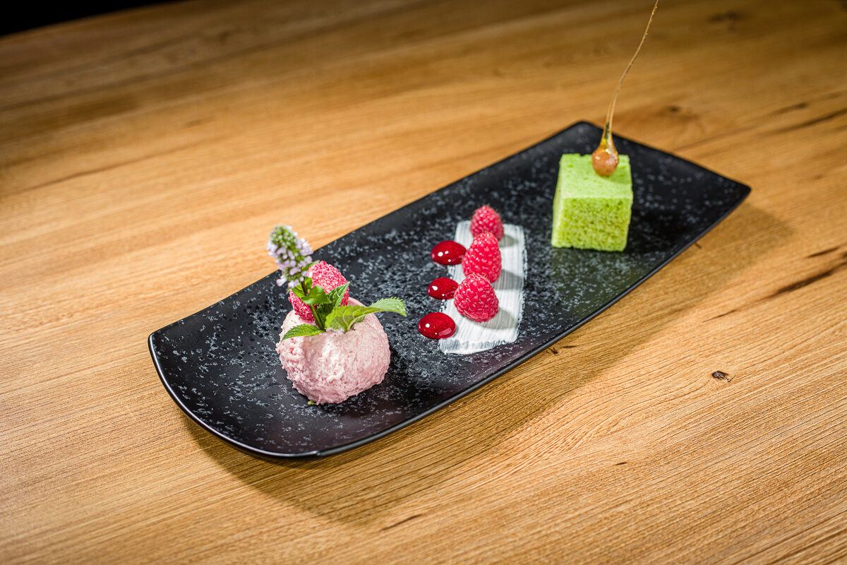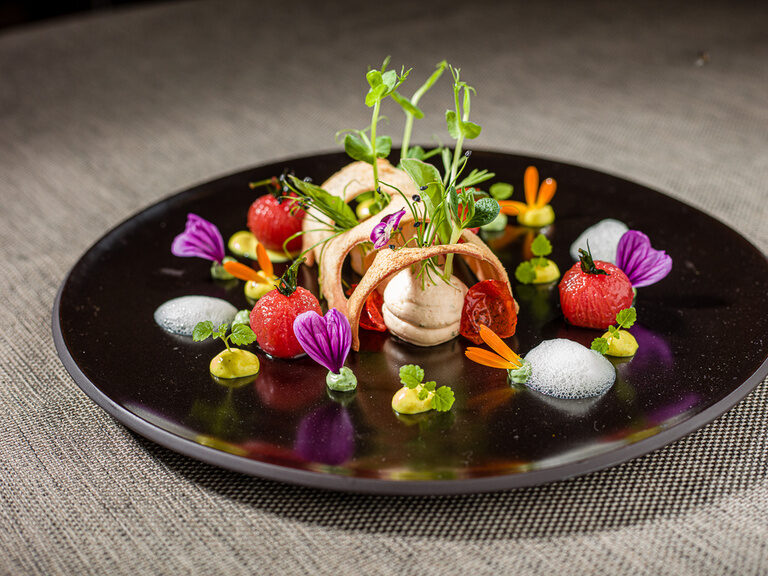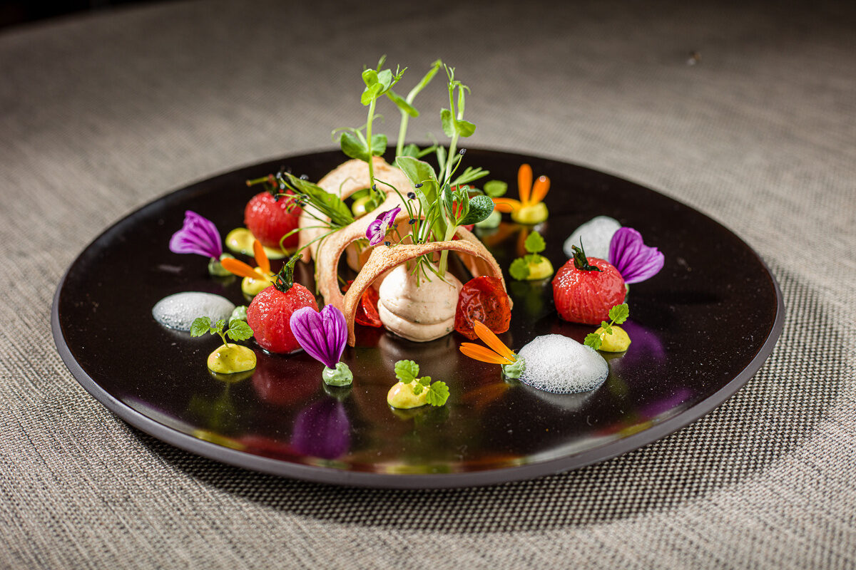 Ein kunstvoll arrangiertes Gericht auf einem Holztisch im Landhaus Sponsel-Regus.