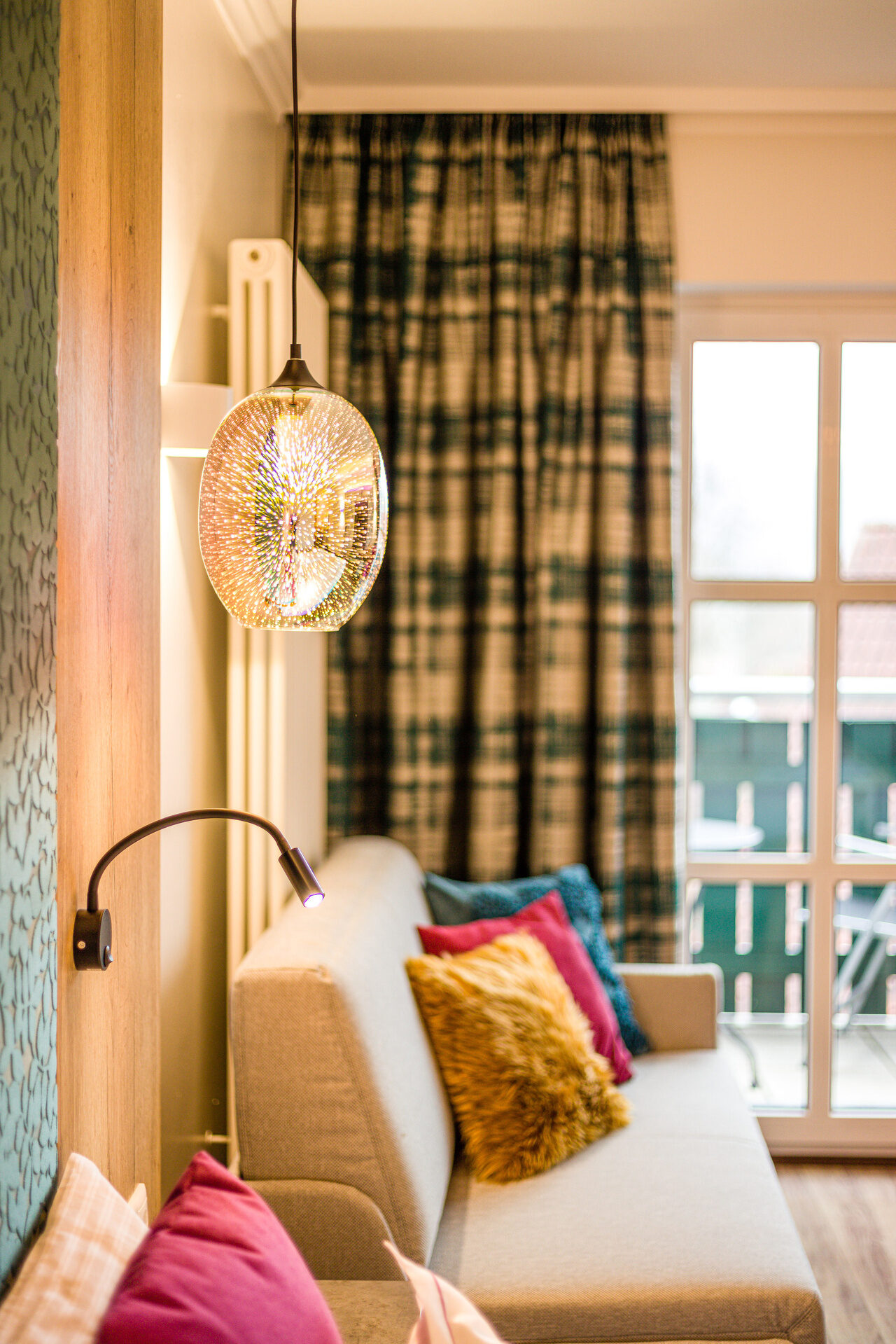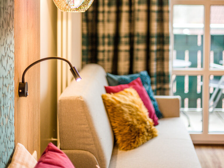 Im hellen Wohnbereich der Landhaus Suite Sonneck lädt eine bequeme Couch zum Entspannen ein.