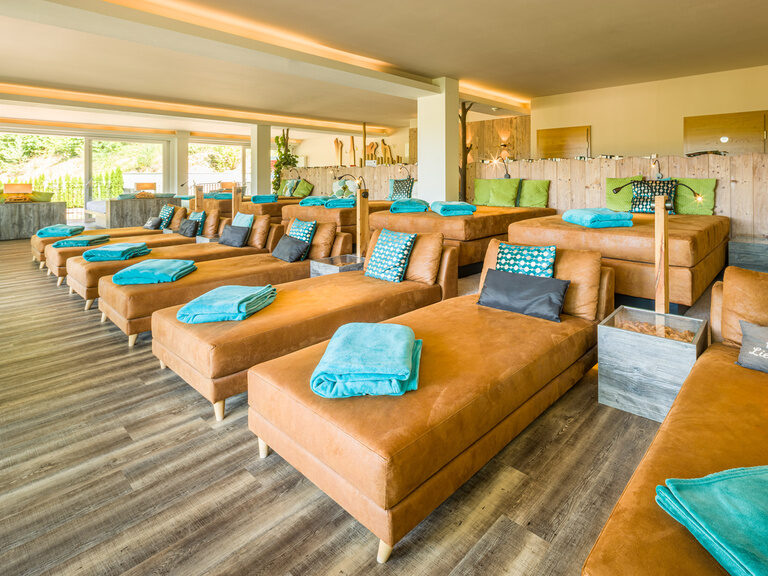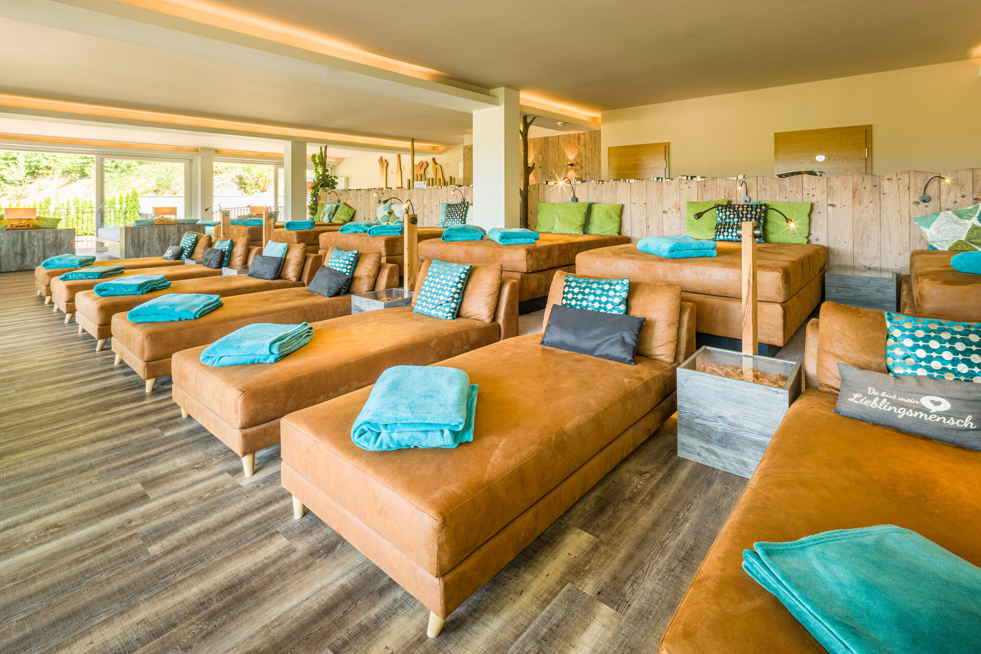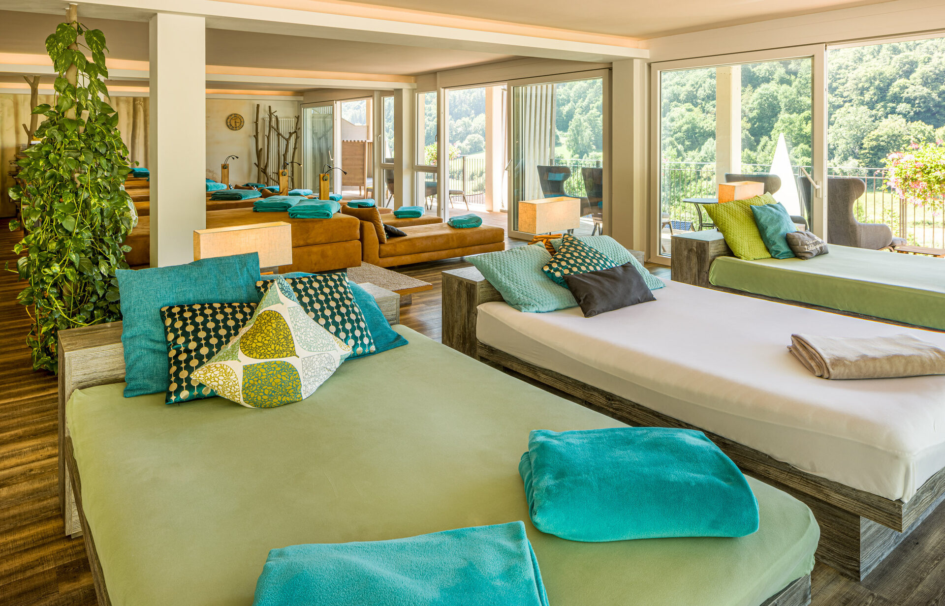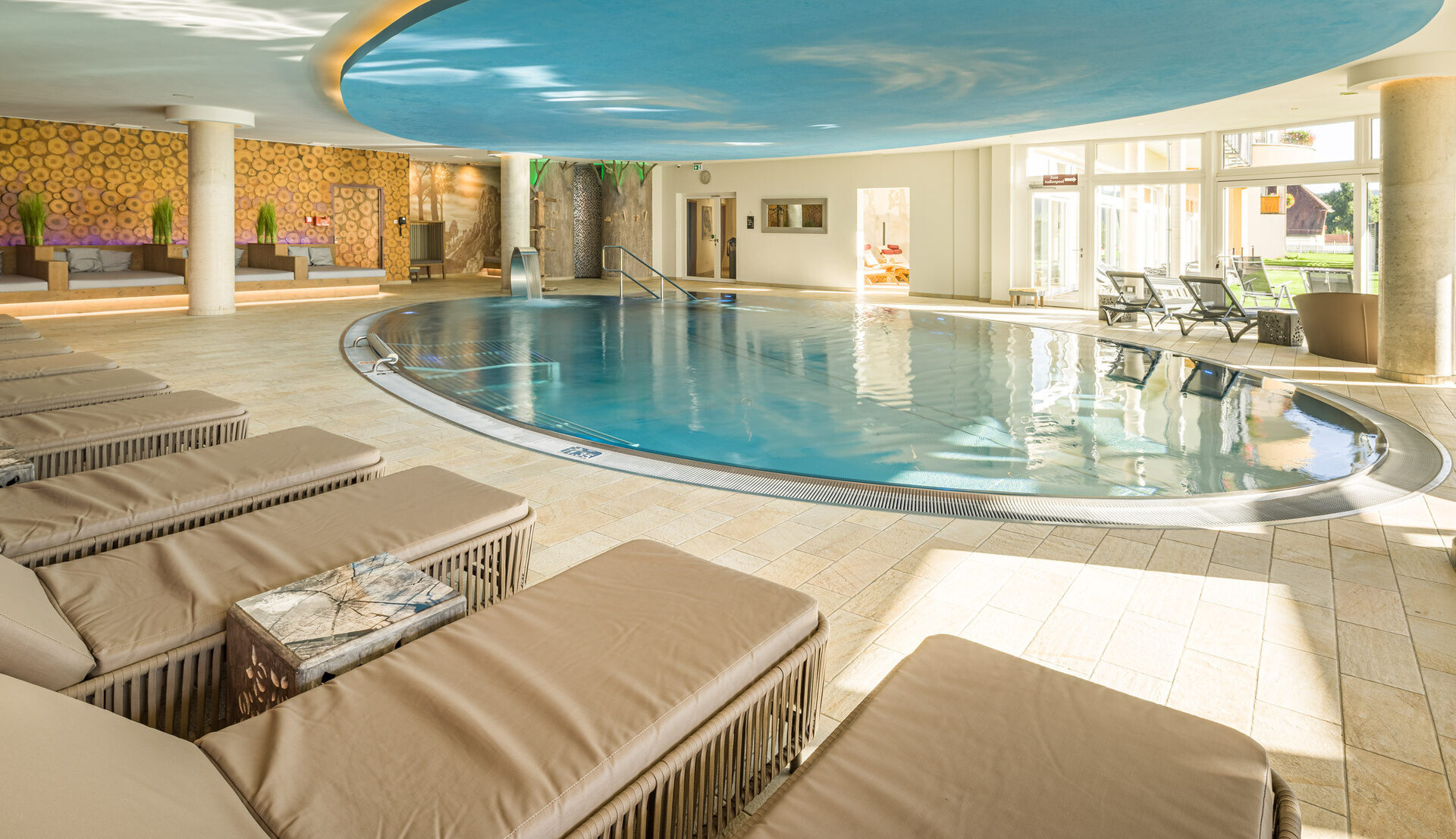 Ein Paar mit Bademänteln bekleidet relax auf einer Liege bei einem Innenpool des Hotels Sponsel-Regus in der Fränkischen Schweiz