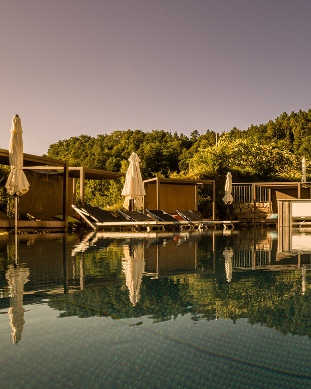 Außenansicht des Wellnesshotels Sponsel-Regus in Franken mit Außenpool und Hotelgebäude in der Abenddämmerung.