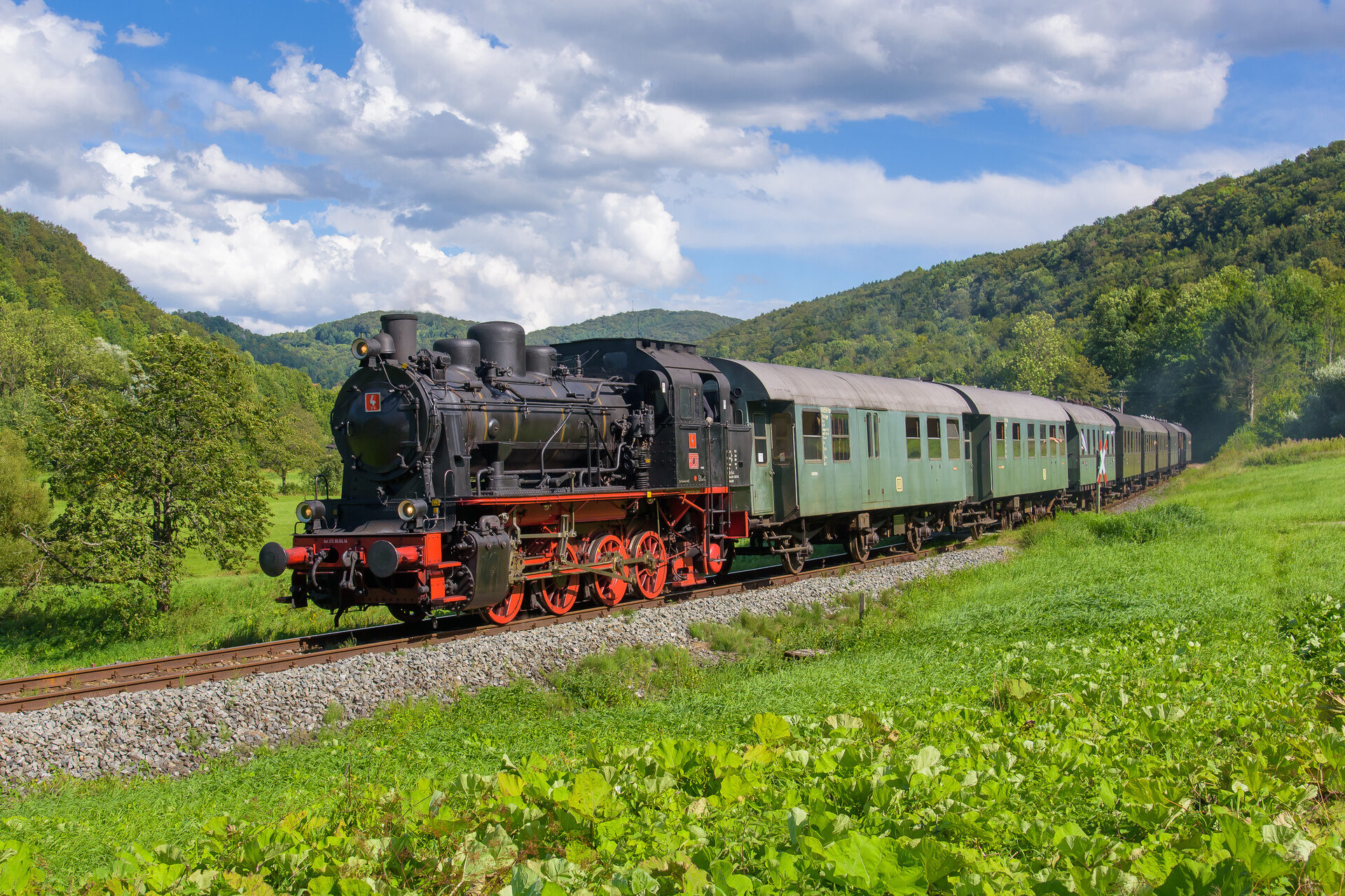 Die Dampfbahn Fränkische Schweiz fährt an einem sonnigen Tag die Gleise entlang.