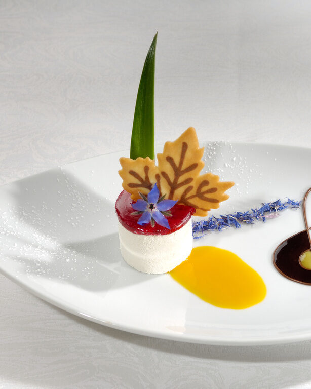 Ein blauer Teller präsentiert ein kunstvoll angerichtetes Dessert im Restaurant Sponsel-Regus