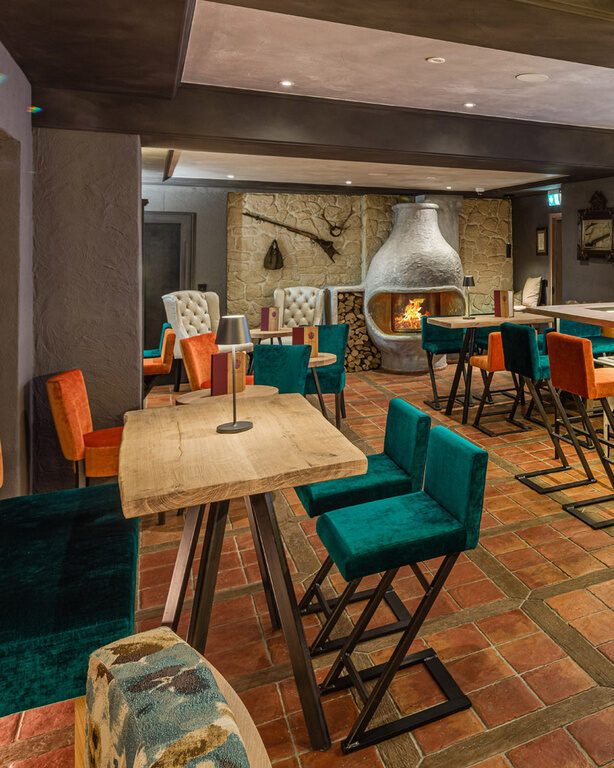 Vor allem im Winter wird der Holzkamin in der Alten Küche befeuert. Genießen Sie Ihren Absacker bei prasselndem Kaminfeuer. Gemütlicher Barcharakter und fränkische Einrichtung prägt den Charme dieses Raumes.