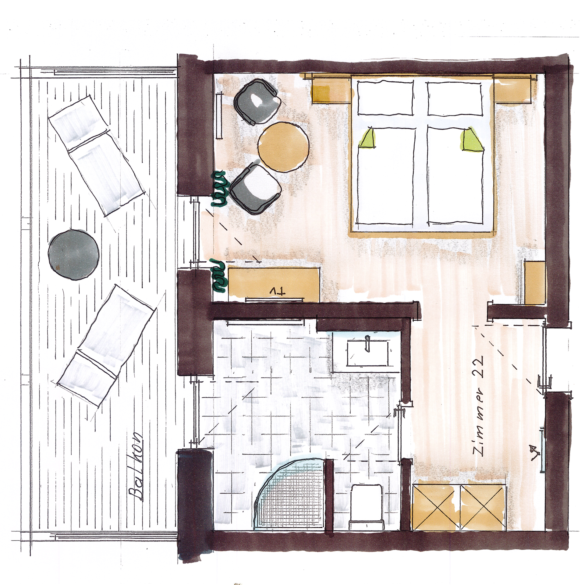 Das Haus Sonneck ist direkt mit dem Haus Mattstein durch einen Verbindungsgang verbunden, also müssen Sie auch hier niemals das Haus verlassen. Das 30 bis 32 m² große Zimmer im Landhausstil hat größtenteils West-Balkon oder Terrasse.