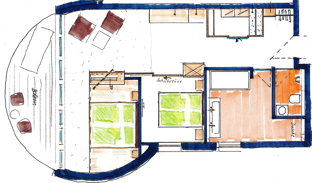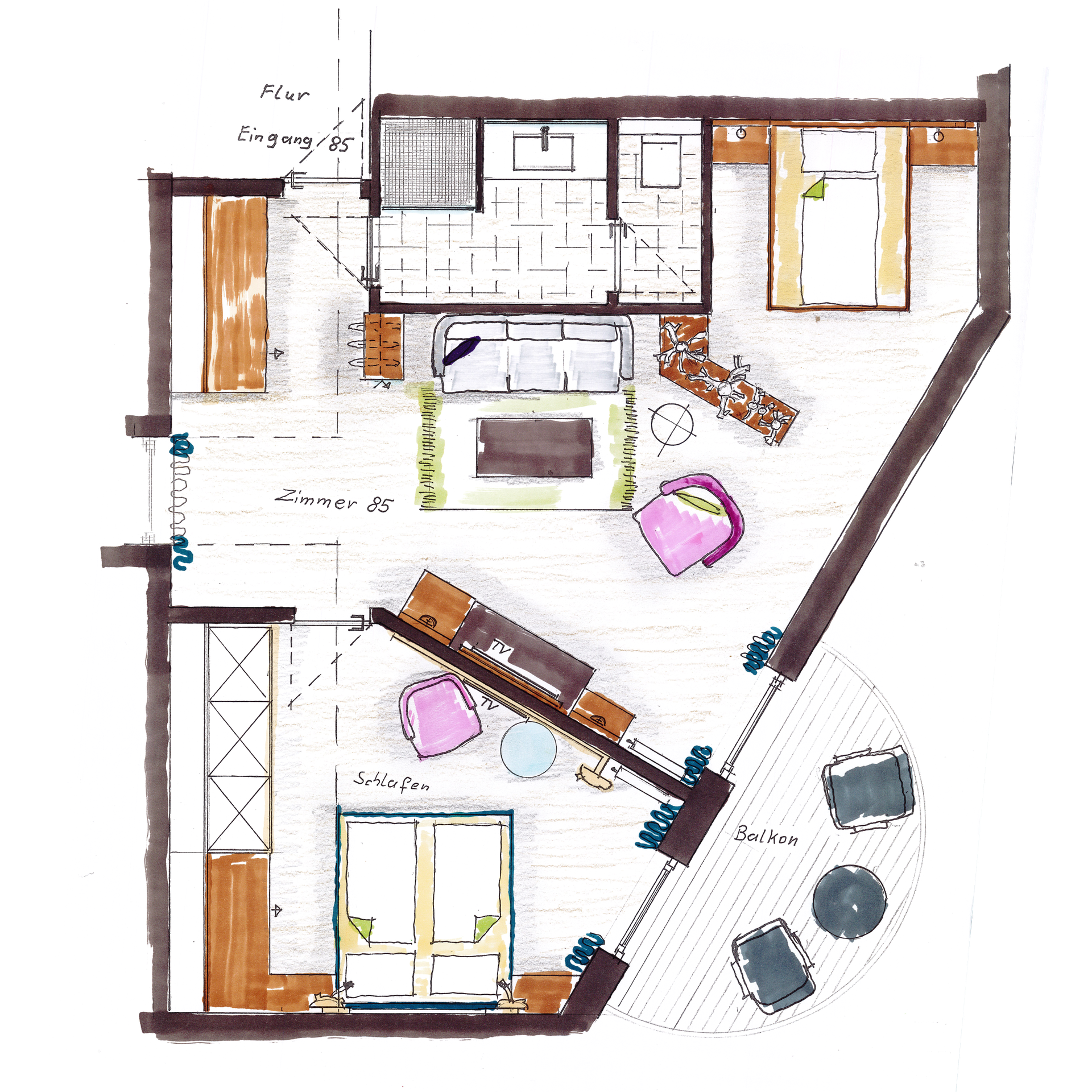 54 m² mit getrenntem Wohn- und Schlafbereich, Wohnbereich mit Doppelcouch, Boxspringbett, zwei Panorama-Balkons nach Süd-Westen und Westen, begehbare Dusche mit separatem WC, Föhn, beleuchtetem Kosmetikspiegel, Safe, Telefon, kostenfreiem W-LAN, zwei TVs und Kühlschrank.