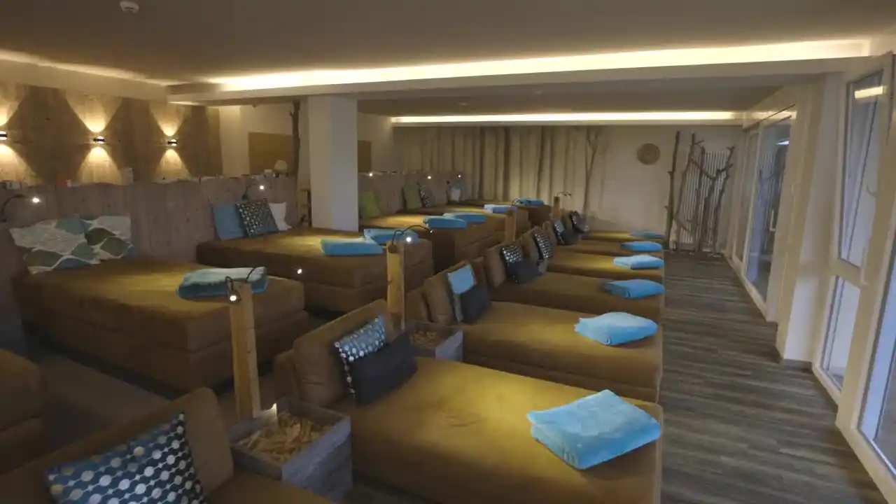 Der Panorama-Ruheraum ist ganzjährig wohlig beheizt und es stehen Tees und Edelsteinwasser kostenfrei zur Verfügung.Im Ruheraum stehen bequeme Liegen, Wasserbetten und Lesesessel für Sie bereit. Natürlich fehlt auch der entsprechende Lesestoff nicht: Im Raum finden Sie eine breite Auswahl an Literatur. Vom Roman über Reiseberichte zur Fränkische Schweiz und Franken oder Sachbücher, stehen viele Bücher zur Auswahl.