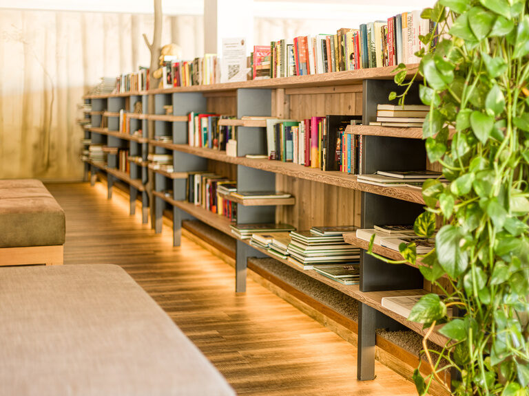 Kuscheln, ruhen, lesen – unter diesem Motto steht der Panorama-Ruheraum mit patentierten Physiotherm-Wärmeliegen für wohlige Entspannung im obersten Stock des „Schlössla“.Dieser ist sowohl per Aufzug, als auch über die Außentreppen des Saunabereiches erreichbar.