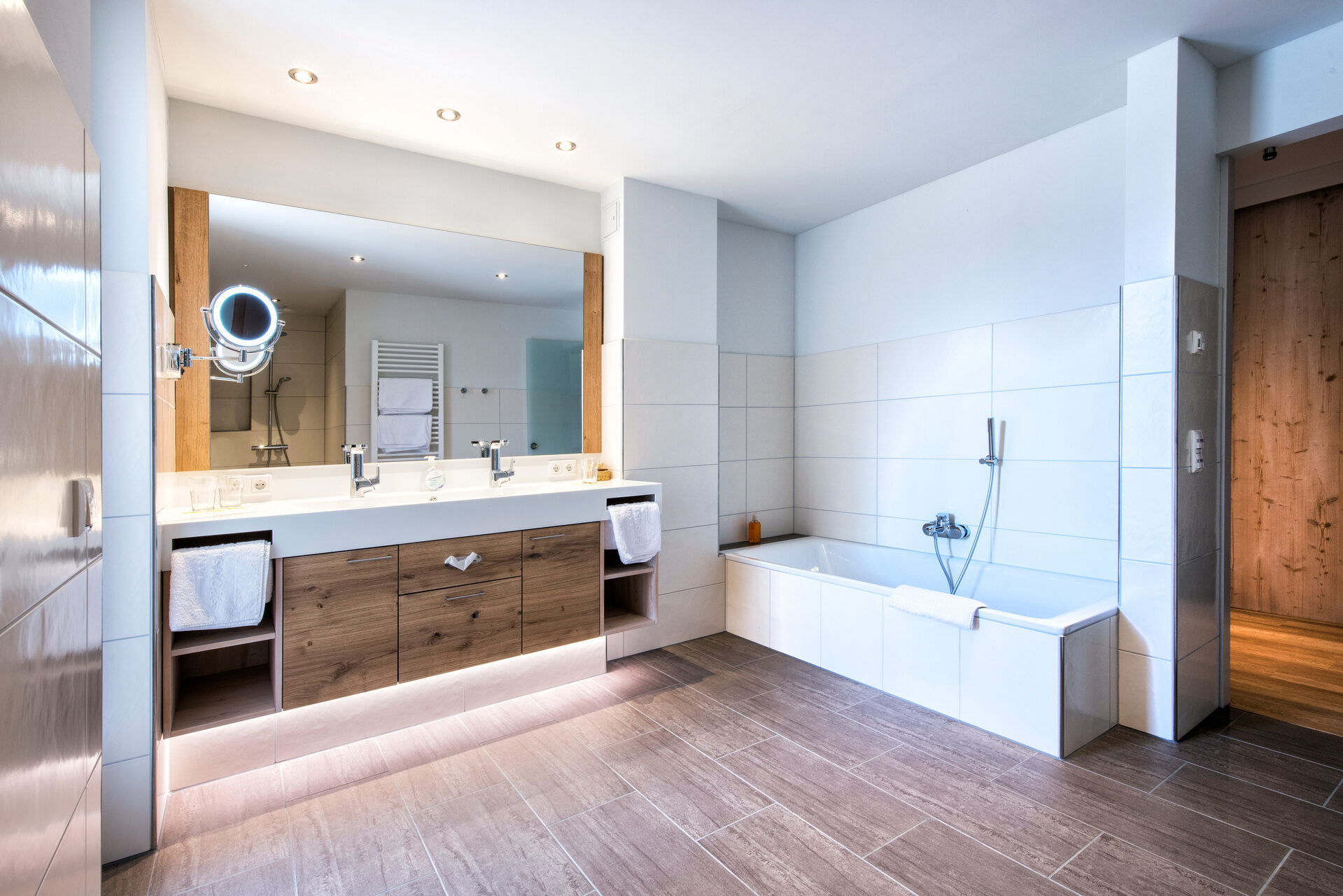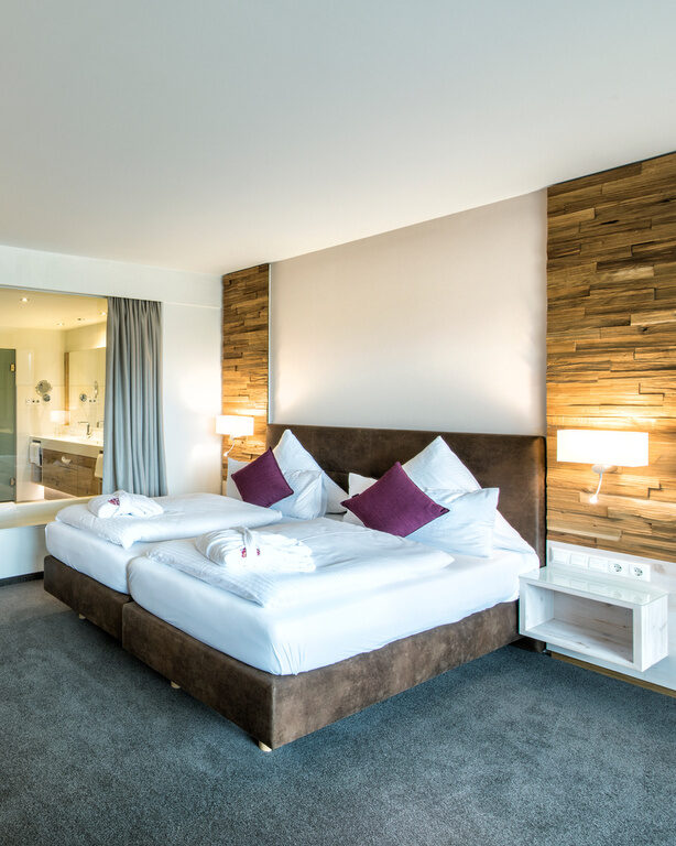 Besondere Atmosphäre erhält die Junior-Suite durch die 4m² Panorama-Glasschreibe zum Tageslichtbad, in dem sowohl eine begehbare Dusche, Badewanne, Doppelwaschbecken und ein separiertes WC zu finden sind.