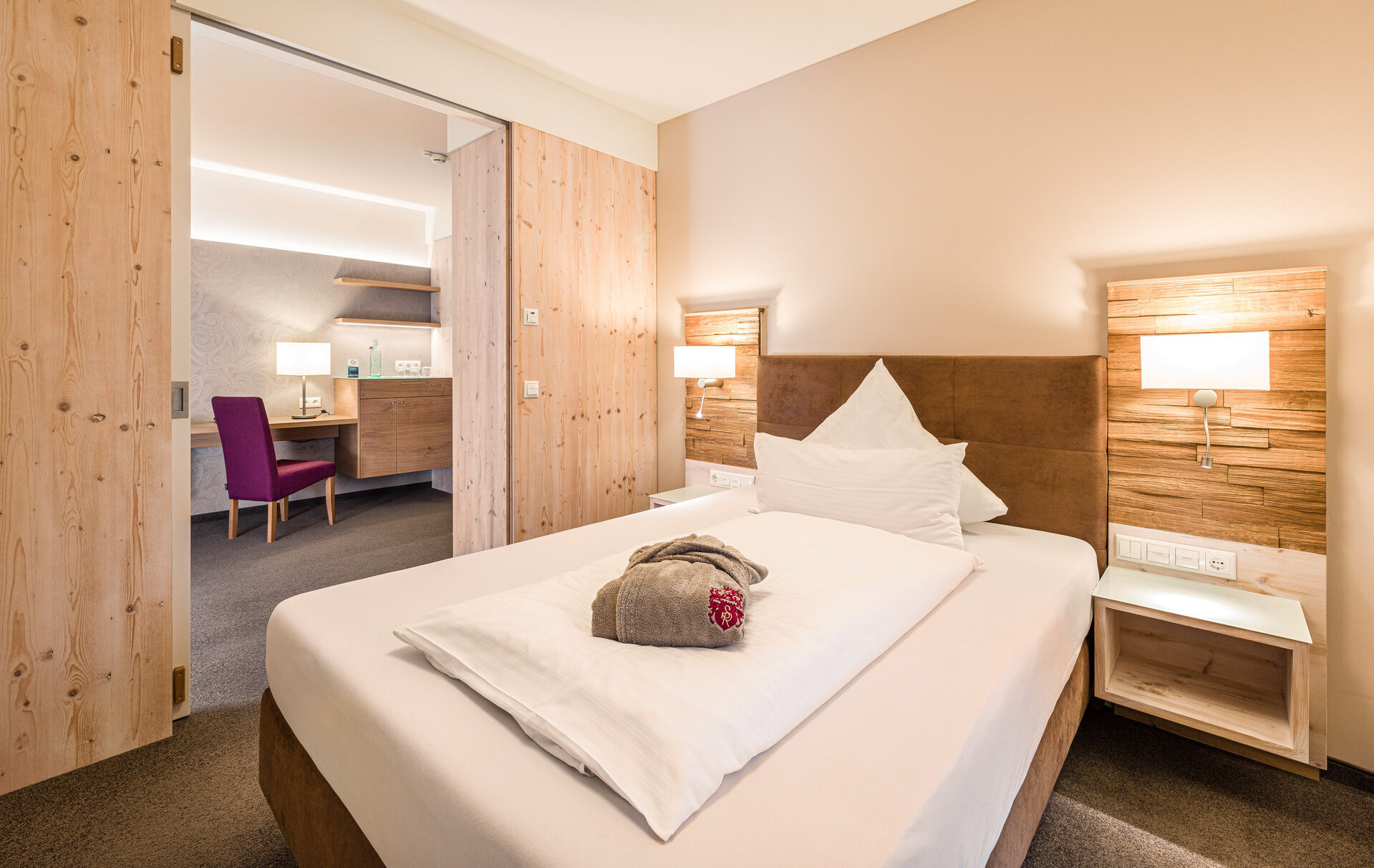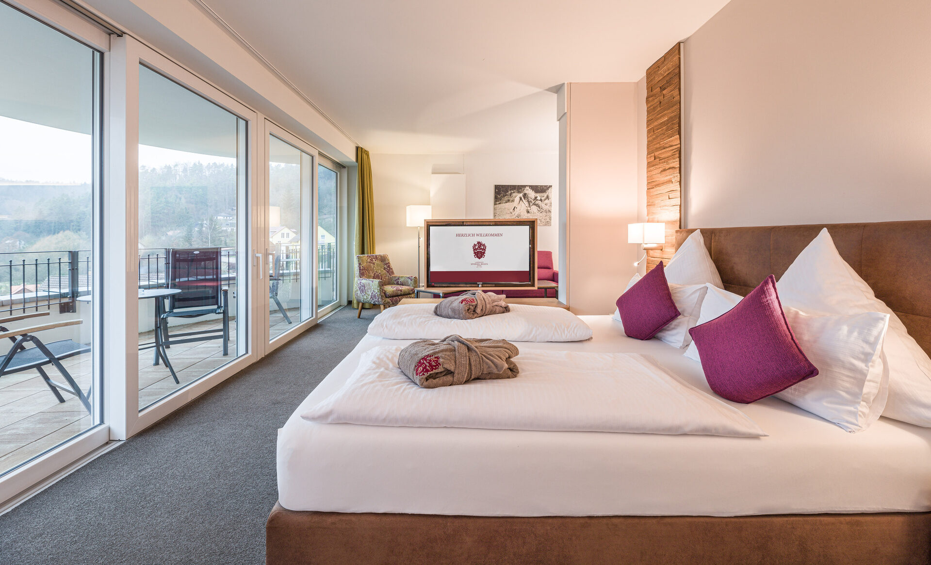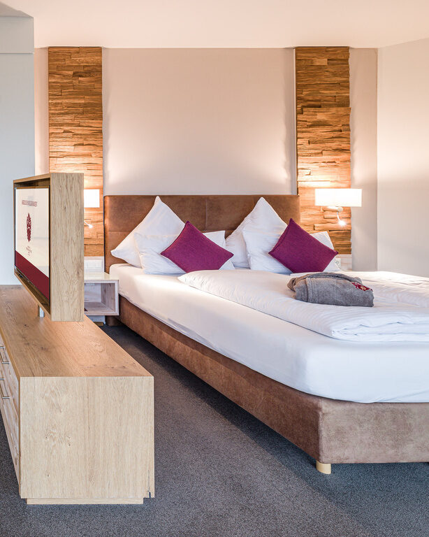 Wohlfühlen auf 70m² in unseren Turm-Suiten mit Panorama-Blick ins Leinleiter-Tal.Darüber hinaus sind sie, wie alle unsere Komfortzimmer, ausgestattet mit Safe, Minibar, Föhn und WLAN.