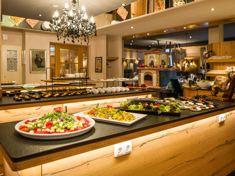 Zu unserem Verwöhnmenü im Rahmen unserer Wohlfühlhalbpension bitten wir Sie, sich zwischen 18:00 und 19:15 Uhr im Restaurant einzufinden. Wir halten täglich eine leckere Buffetauswahl für Sie bereit. Das abendliche Salat- und Vorspeisenbuffet steht Ihnen bis 19:30 Uhr zur Verfügung.